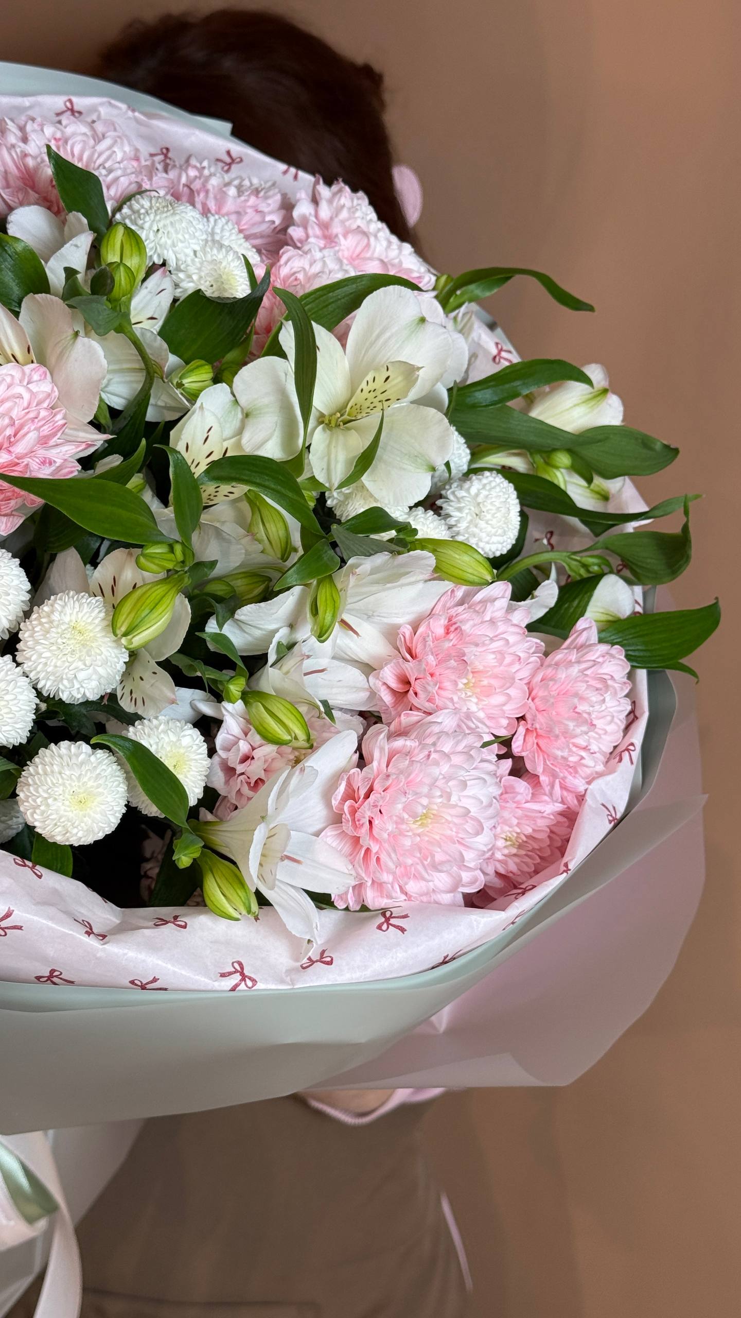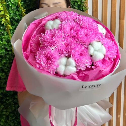 Букет «Алина» — это роскошная и объёмная композиция, созданная для особенного повода. Нежные альстромерии в гармонии с пушистыми хризантемами Алтай и Ньютон формируют пышный и выразительный образ, полный свежести и утончённости. Такой букет станет прекрасным знаком внимания, чтобы порадовать, удивить и подарить незабываемые эмоции вашей любимой девушке, жене, маме, сестре или подруге в день рождения, 8 Марта, юбилей или просто для самого особенного момента.