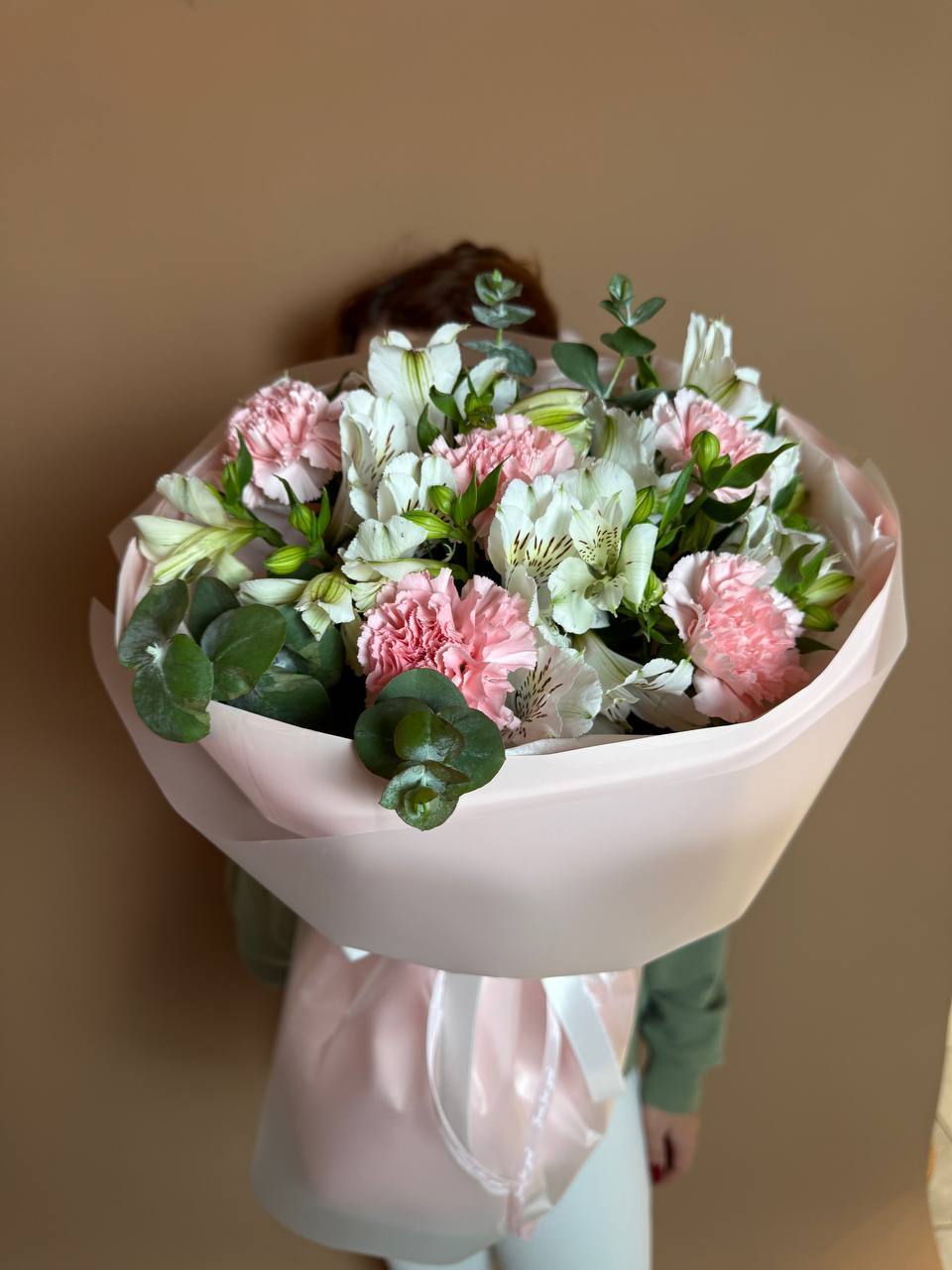 Букет "Альстра" - это воплощение нежности и легкости, созданное из воздушных альстромерий, нежных диантусов и ароматного эвкалипта.