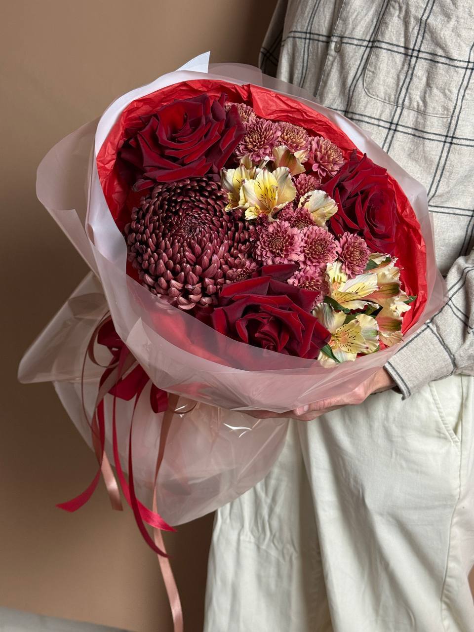 Букет "Алые Реки" - это страстная и энергичная композиция, вдохновленная бурной красотой природы. Яркие красные розы, глубокие шоколадные хризантемы, воздушные альстромерии и игривые пуговки создают атмосферу силы, любви и незабываемых эмоций.