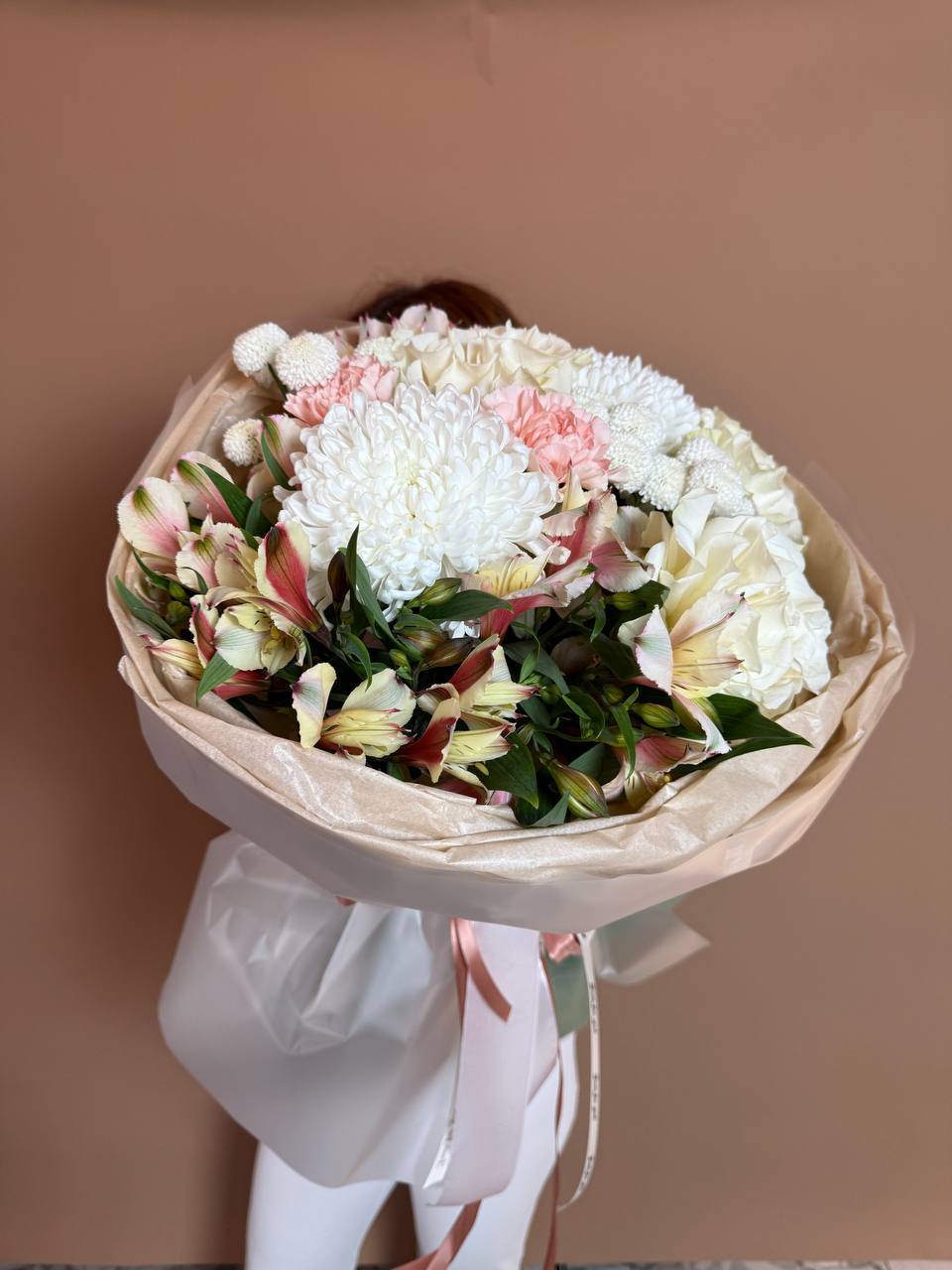 Букет "Айгуль" - это гармоничное сочетание элегантности и нежности, созданное из благородных роз "Мондиаль", пышных хризантем, игривых хризантем-пуговок, воздушных альстромерий и нежных диантусов.
