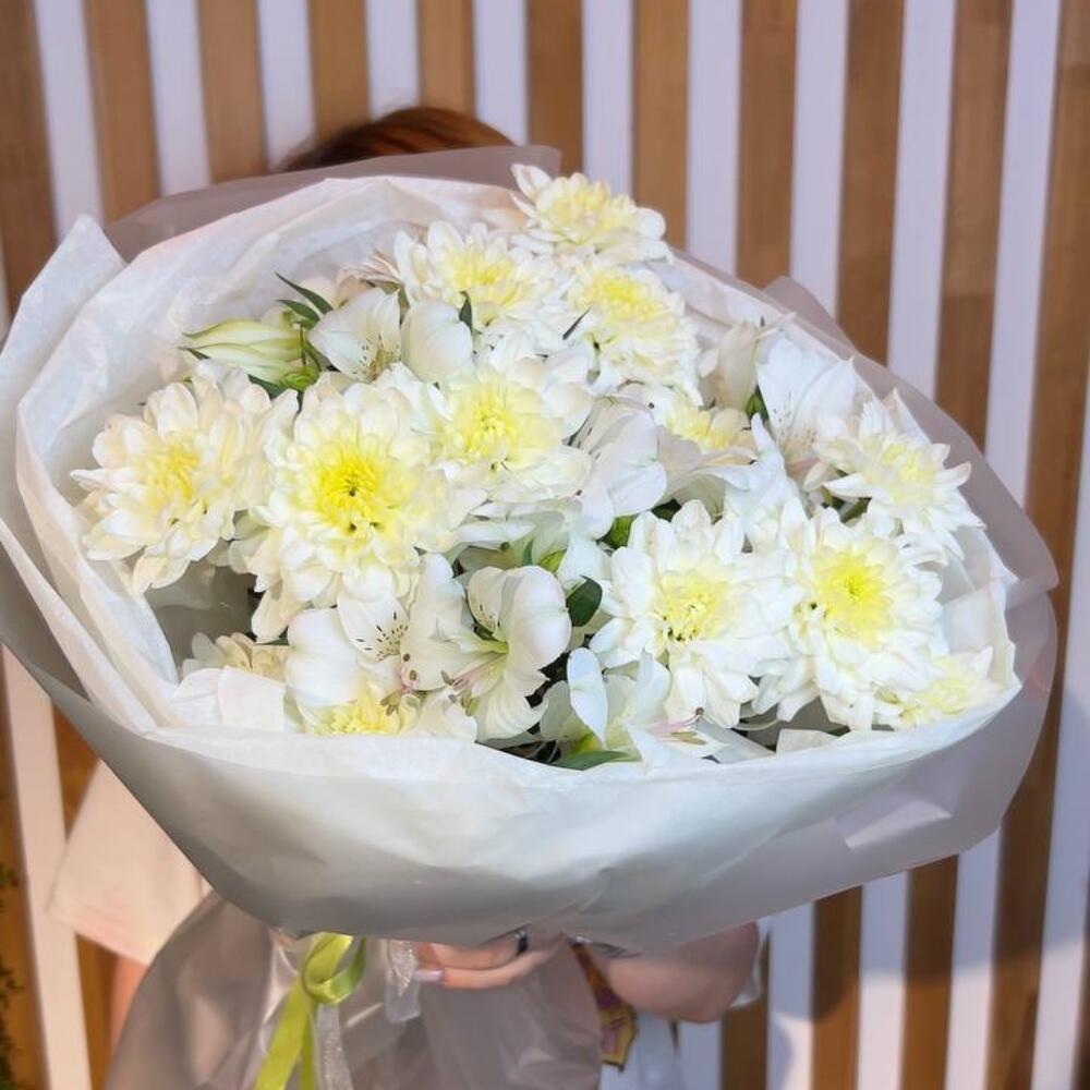 Букет «Элизабет» — нежная и трогательная композиция, которая очаровывает лёгкостью и воздушностью. Яркие альстромерии переплетаются с пушистыми кустовыми хризантемами, создавая гармонию нежных оттенков и естественной свежести.