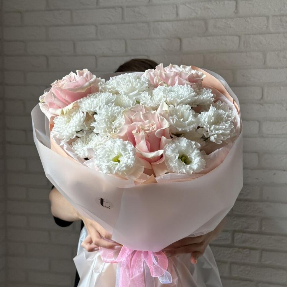 Букет «Французское свидание» — утончённая композиция, наполненная романтикой и нежностью. Лёгкие лепестки эустомы переплетаются с пышными кустовыми хризантемами и элегантными французскими розами, создавая атмосферу изысканного свидания в сердце Парижа. Такой букет дарит ощущение тепла, лёгкости и особого шарма.
