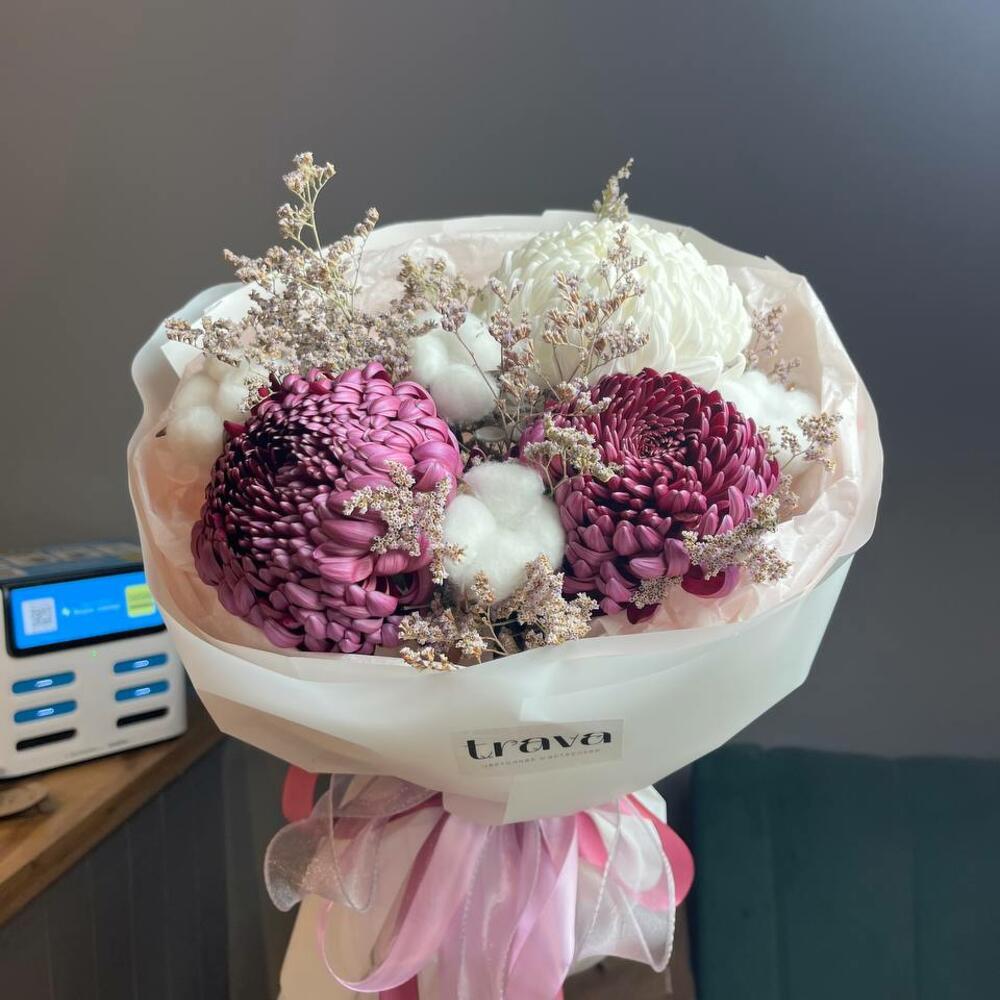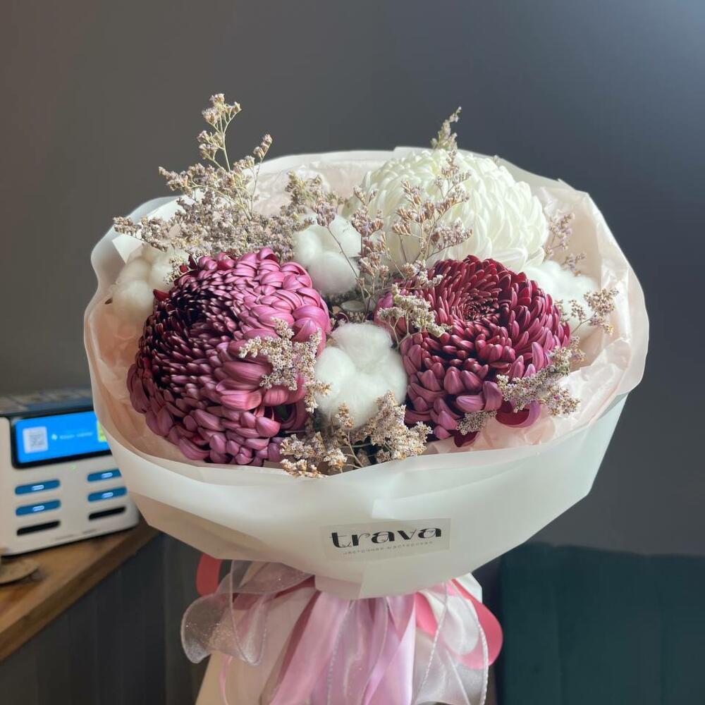 В цветочной мастерской **Trava** рождаются букеты из пионов, хризантем, эустом, альстромерий и других прекрасных цветов. Наши композиции — отличный выбор **на день рождения**, **на годовщину**, или просто чтобы порадовать **любимую**.