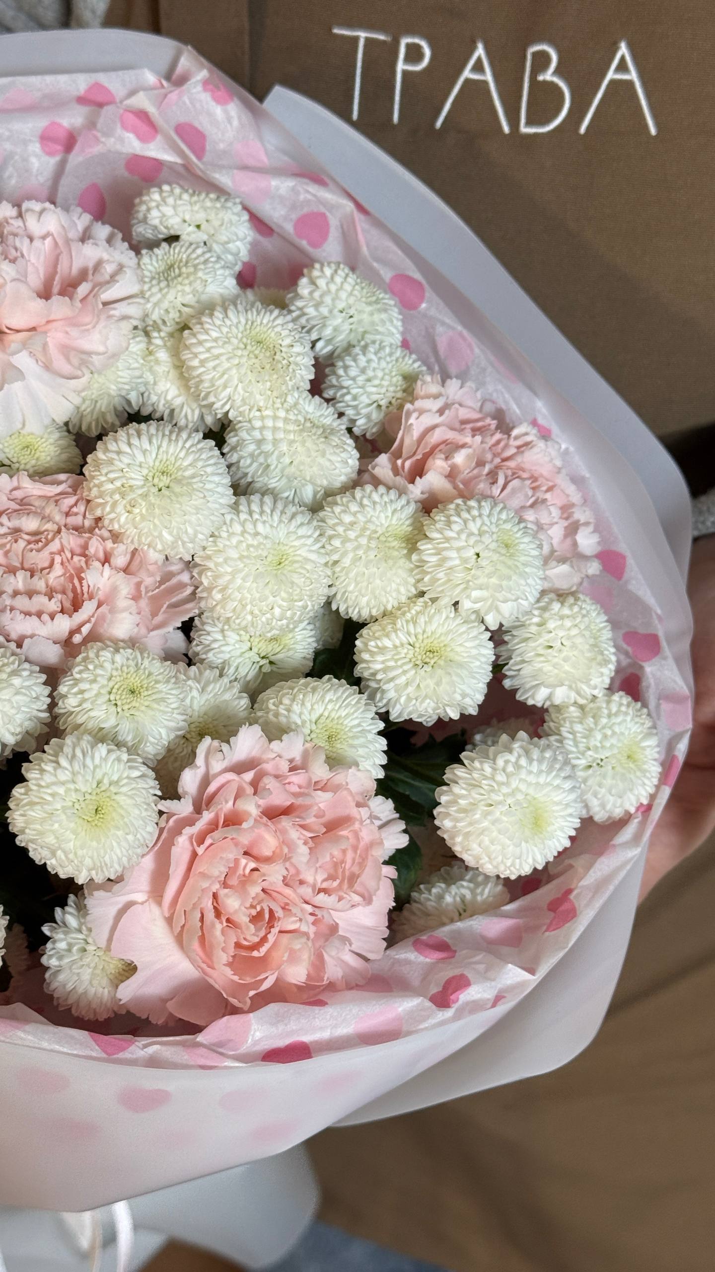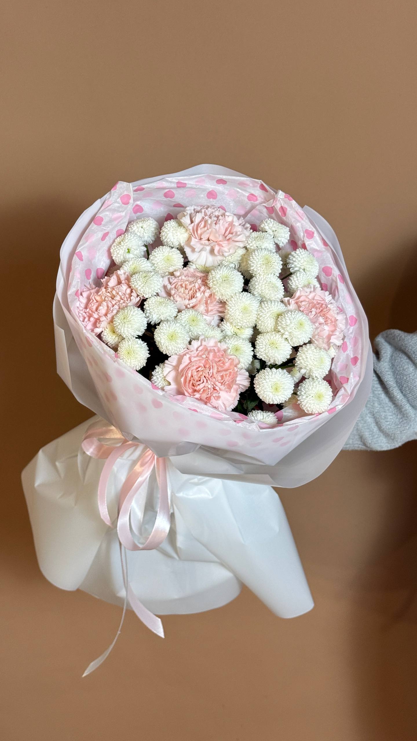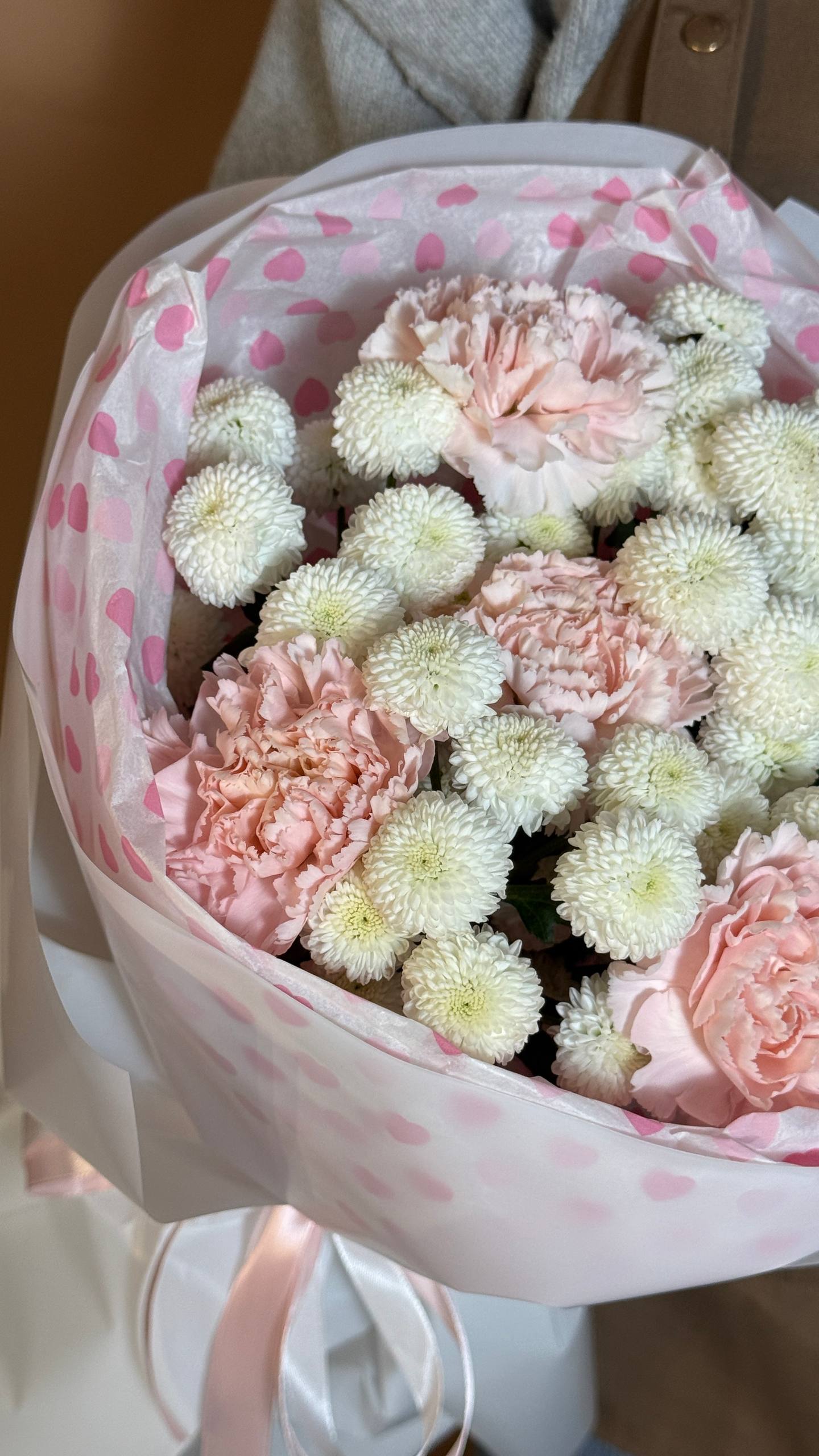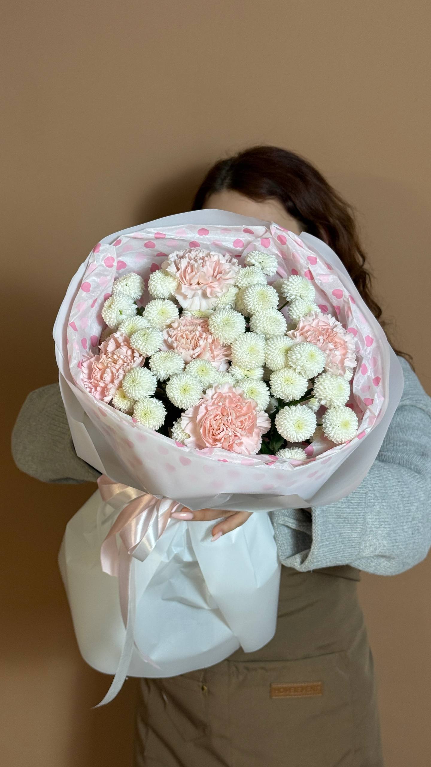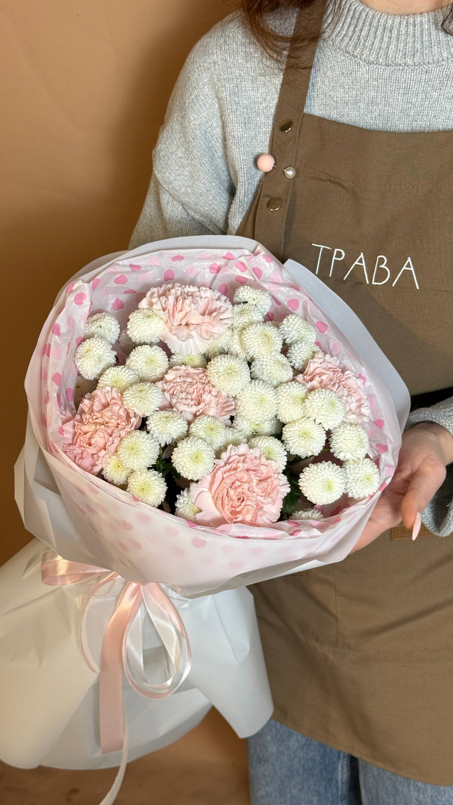 Букет «Маршмеллоу M» — это нежная и воздушная композиция среднего формата, созданная для тех, кто любит объём и лёгкость. Пушистые хризантемы Ньютон в гармонии с трогательными диантусами формируют мягкий, уютный и очень стильный образ, напоминающий о любимом лакомстве. Такой букет станет прекрасным знаком внимания, чтобы порадовать, удивить и подарить искренние тёплые эмоции вашей девушке, подруге, сестре, коллеге или близкому человеку.