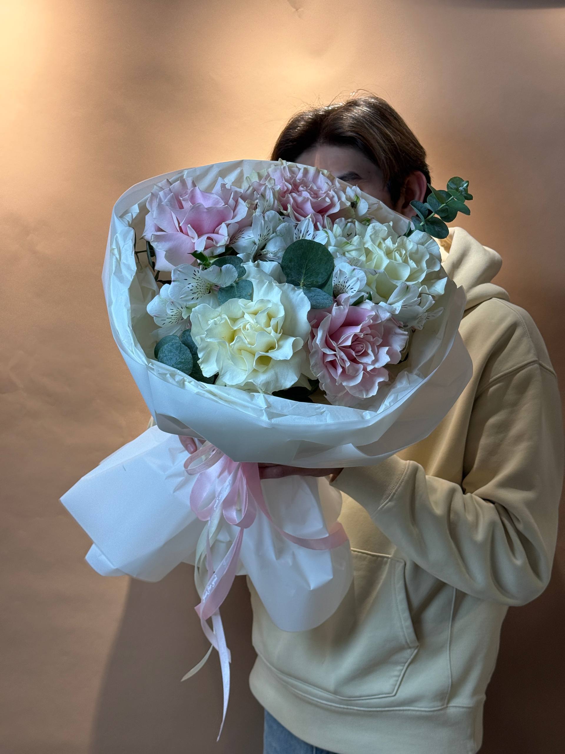 "Трава доставка цветов" представляет букет "Нежное Признание" – утонченная и романтичная композиция, сотканная из изысканных оттенков и тонких ароматов. Этот букет, где нежные розовые и классические белые розы "Мондиаль" гармонично сочетаются с изящными альстромериями и ароматным эвкалиптом, способен растопить любое сердце.