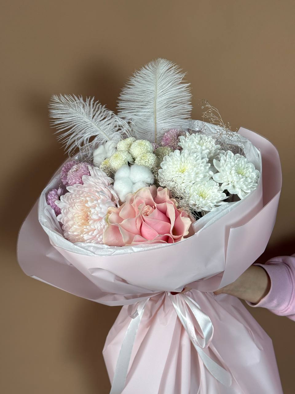 "Трава доставка цветов" представляет букет "Нежный Шёпот" – изысканная и утонченная композиция, сотканная из нежных оттенков и воздушных текстур. Этот букет, объединяющий в себе благородную розовую розу "Мондиаль", элегантную одноголовую хризантему, очаровательные фиолетовые хризантемы "Пуговка", пышную кустовую хризантему, мягкий хлопок и воздушные перья, создает неповторимое ощущение легкости и изящества.