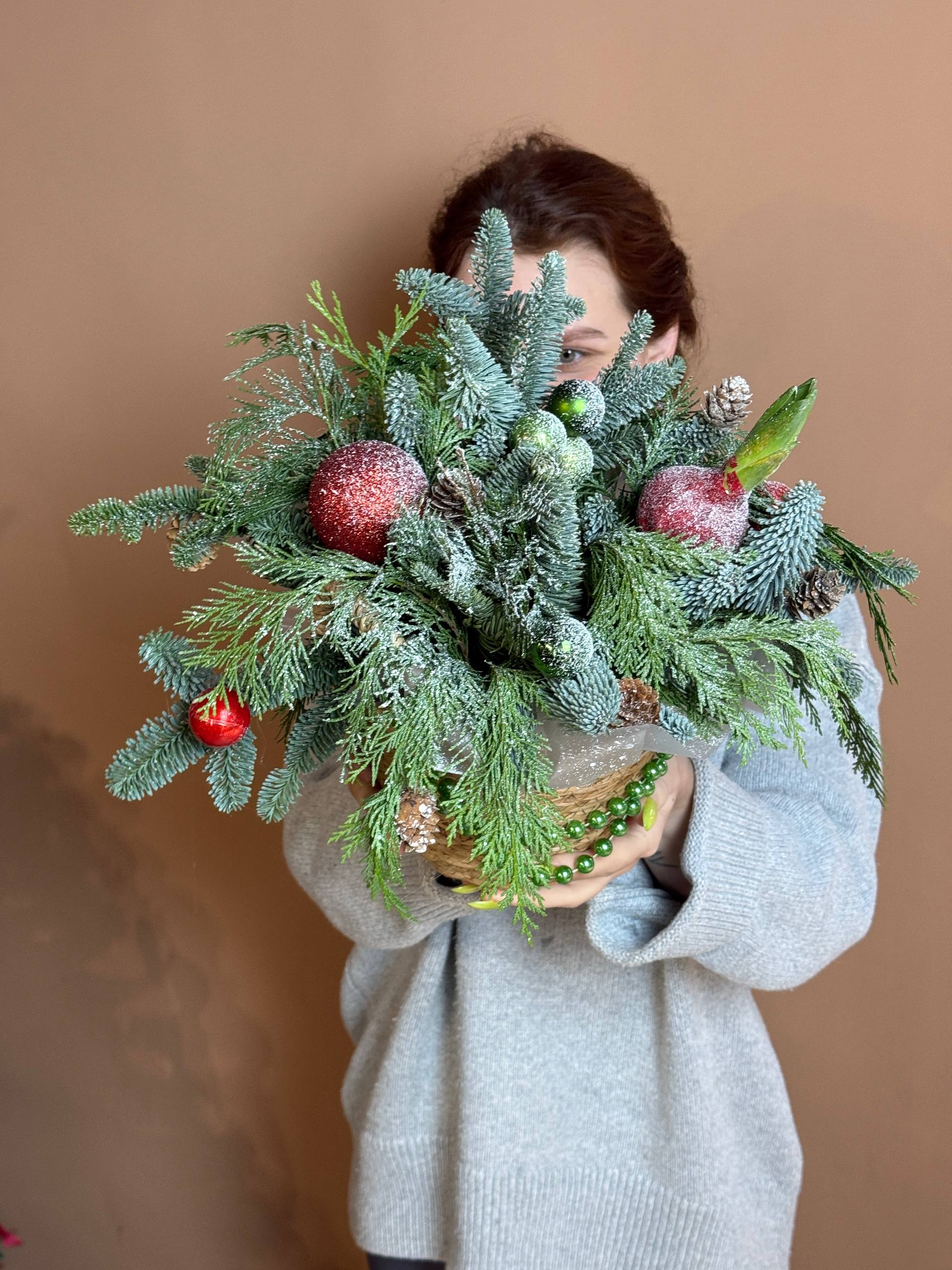 Оформление: Композиция бережно собрана, где ароматные хвойные ветви служат фоном для блестящих новогодних шаров и переливающихся бус. Природные шишки и нежная луковица гиацинта добавляют уникального очарования и создают ощущение предвкушения весеннего цветения, привнося в праздник живое тепло.