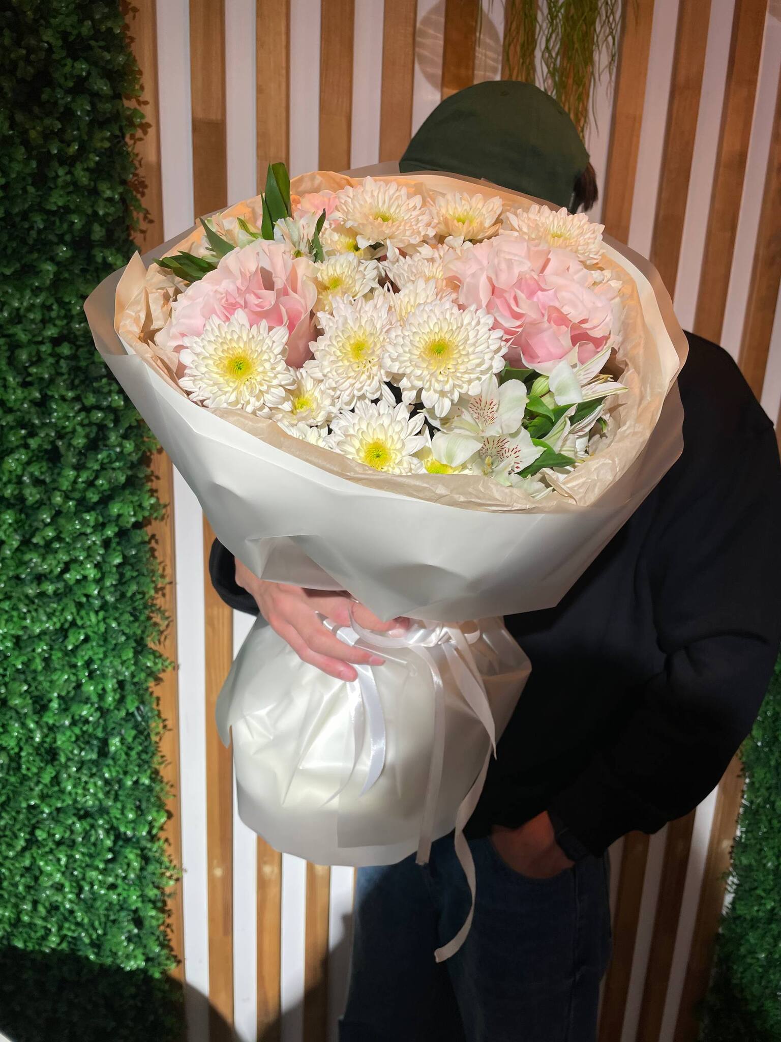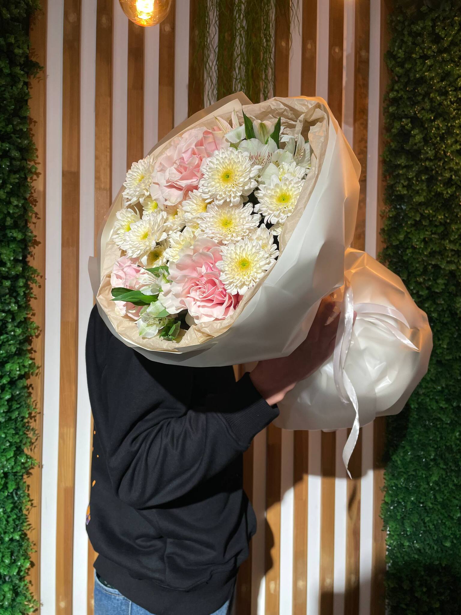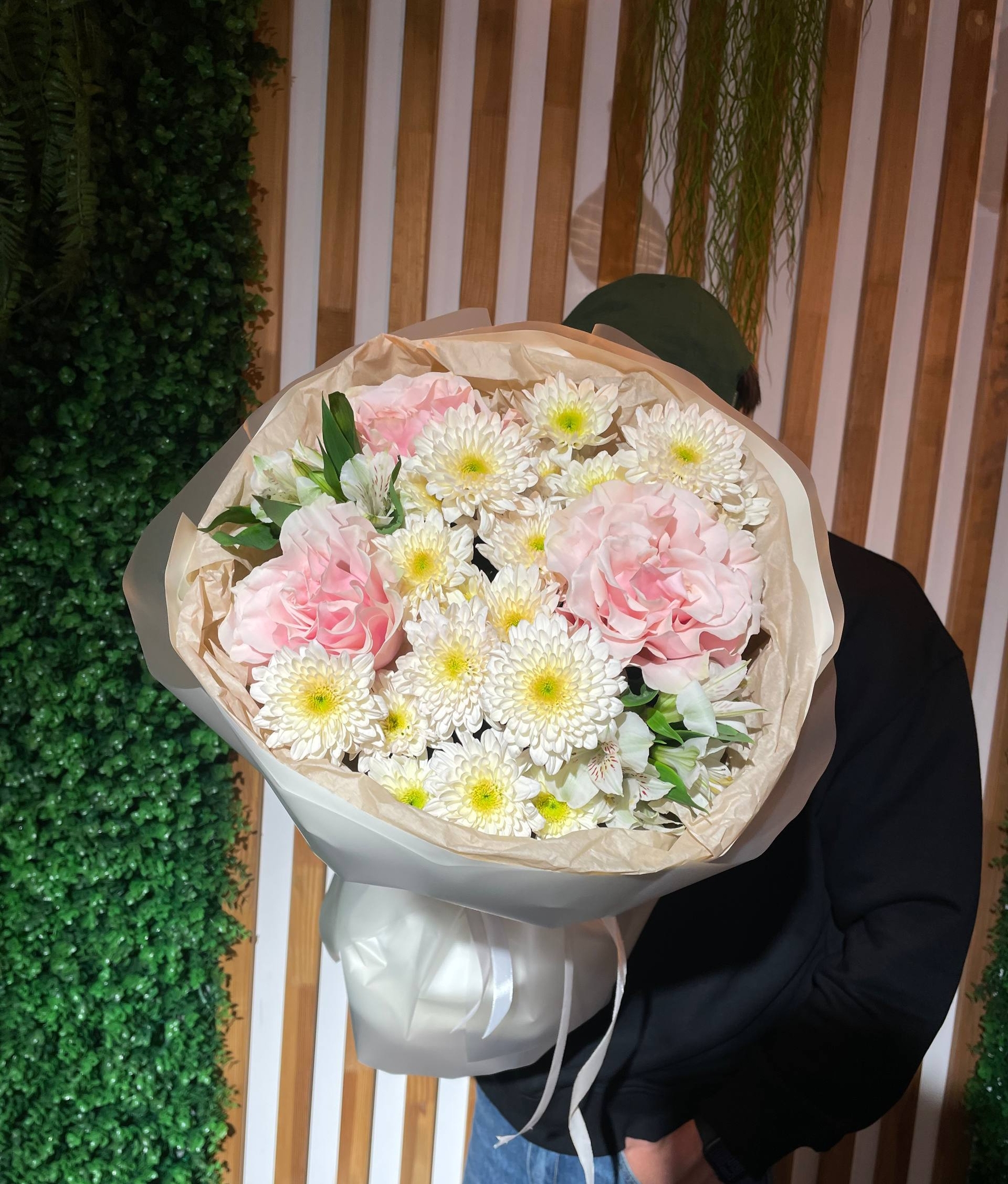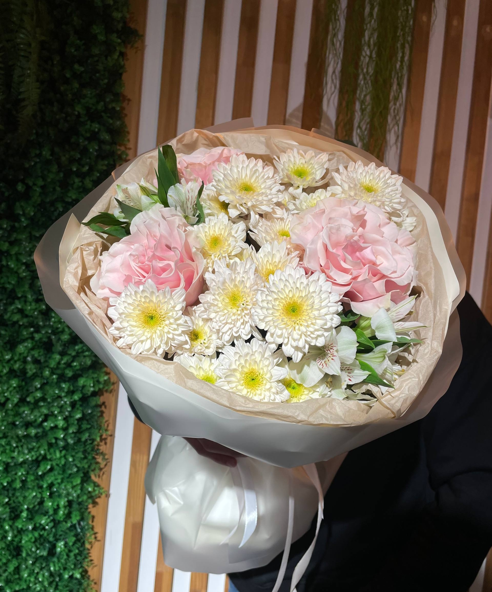 Этот букет, словно воплощение осеннего очарования, согревает своими теплыми оттенками и создает уютное настроение. Гармоничное сочетание хризантемы "Дубок", эквадорской розы и альстромерии рождает яркую и запоминающуюся композицию.
