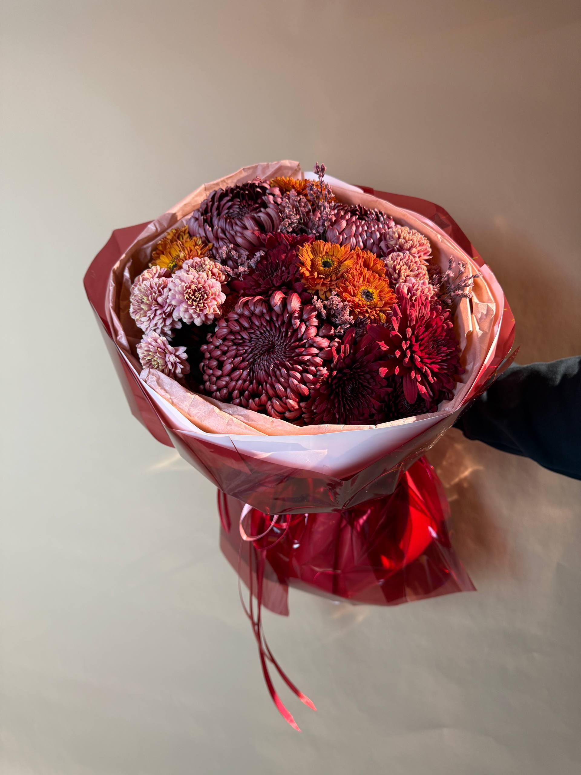 "Трава доставка цветов" представляет букет "Осенний Вдох" – яркая и объемная композиция, воплощающая богатство и разнообразие осенних красок. Этот букет, где пышные одноголовые хризантемы "Бигуди" гармонично сочетаются с многоцветными дубками и воздушным лимониумом, создает ощущение природной свежести и тепла.