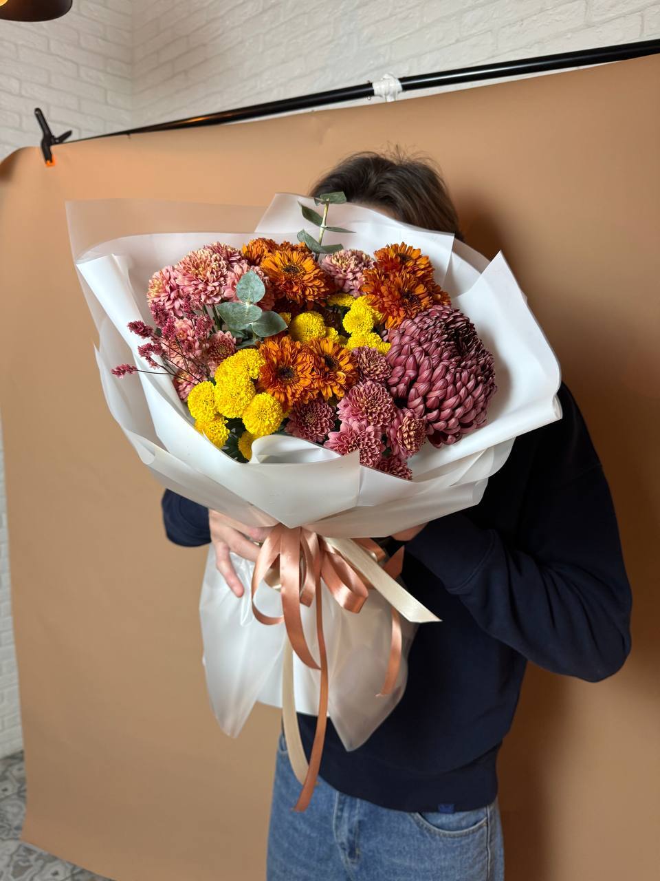 "Трава доставка цветов" представляет букет "Осенняя Палитра" – живописная композиция, вдохновленная богатством красок природы. Этот букет, сочетающий в себе благородство шоколадной хризантемы, разнообразие оттенков дубка, свежесть эвкалипта и воздушность кермека, создан для тех, кто ценит естественную красоту и утонченность.