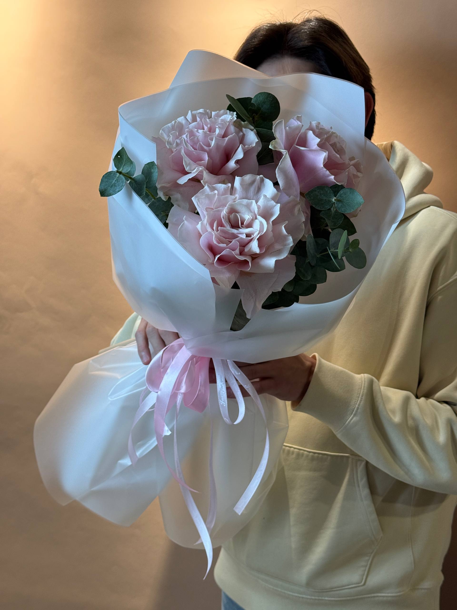 Оформление: Букет упакован в дизайнерскую бумагу нежного розового оттенка, перевязан тонкой атласной лентой.