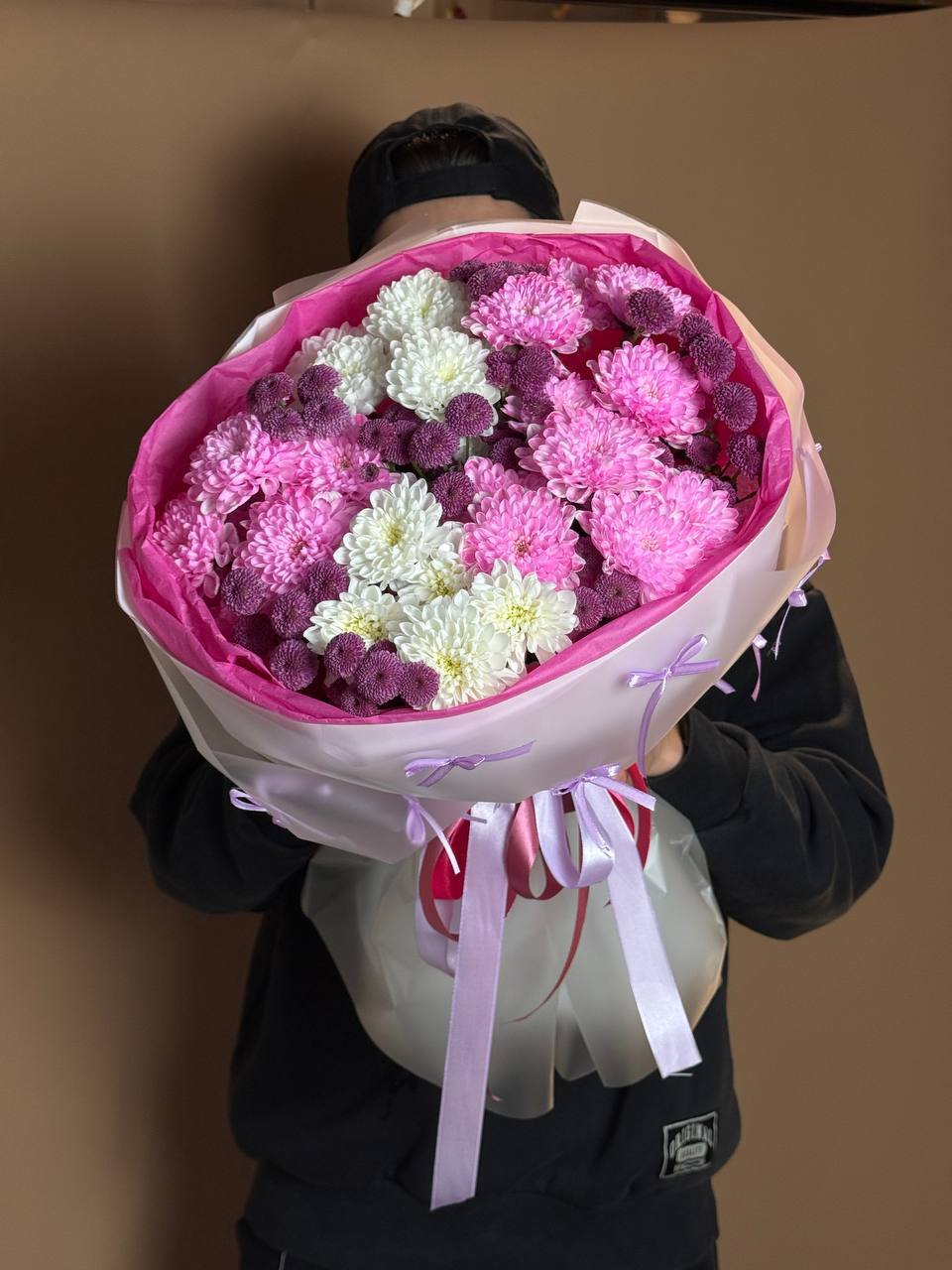 Букет с бантиками "Малинка" - это яркая, игривая и невероятно милая композиция, созданная для того, чтобы дарить улыбки и хорошее настроение! Сочетание пышных хризантем и задорных бантиков делает этот букет идеальным подарком для юных леди и всех, кто молод душой.