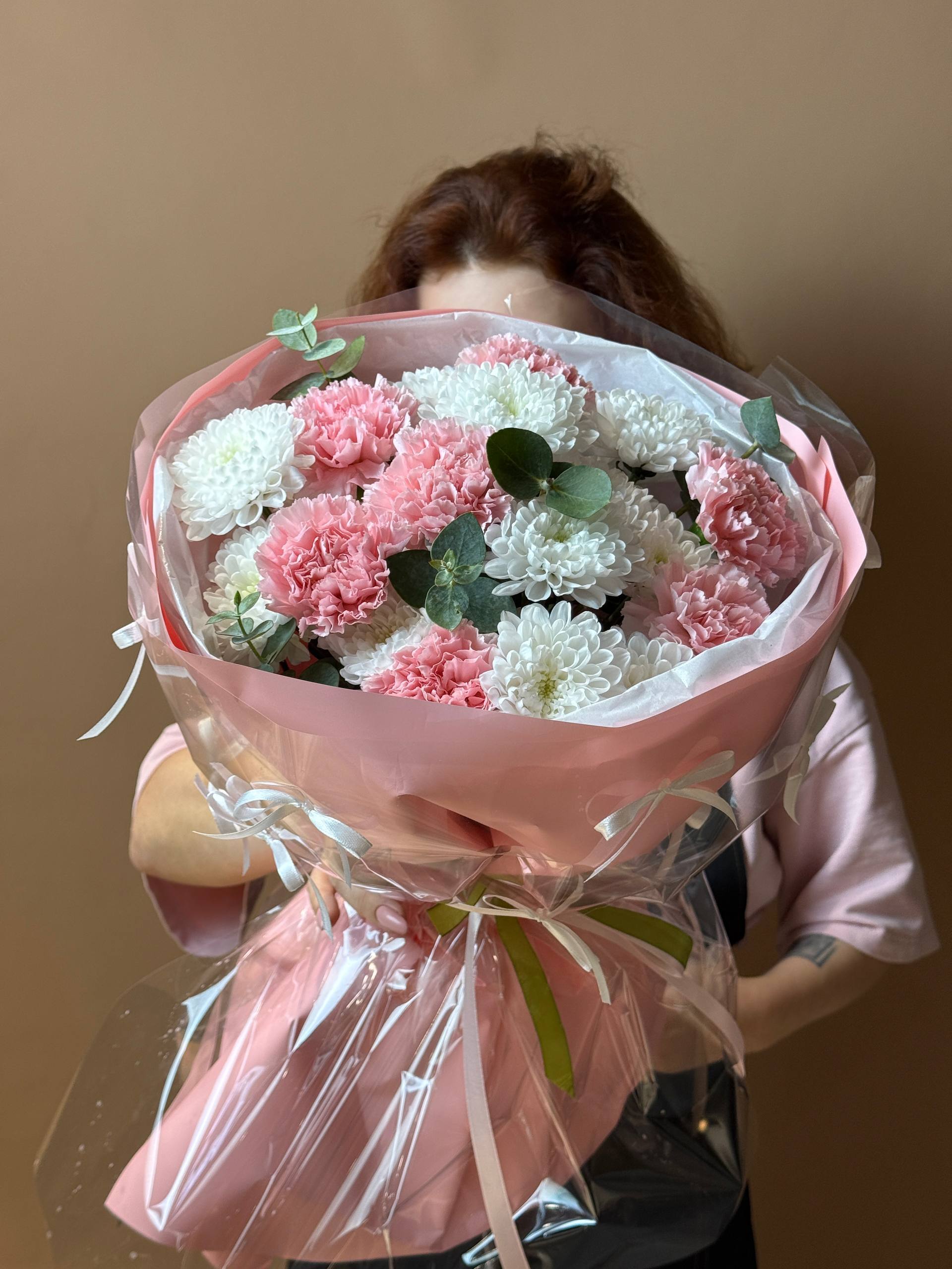 "Трава доставка цветов" представляет букет "Счастье в Деталях" – нежная и трогательная композиция, сотканная из утонченных элементов. Этот букет, где пышные кустовые хризантемы, пикантные диантусы и ароматный эвкалипт дополнены изящными бантиками, создает атмосферу уюта и заботы.