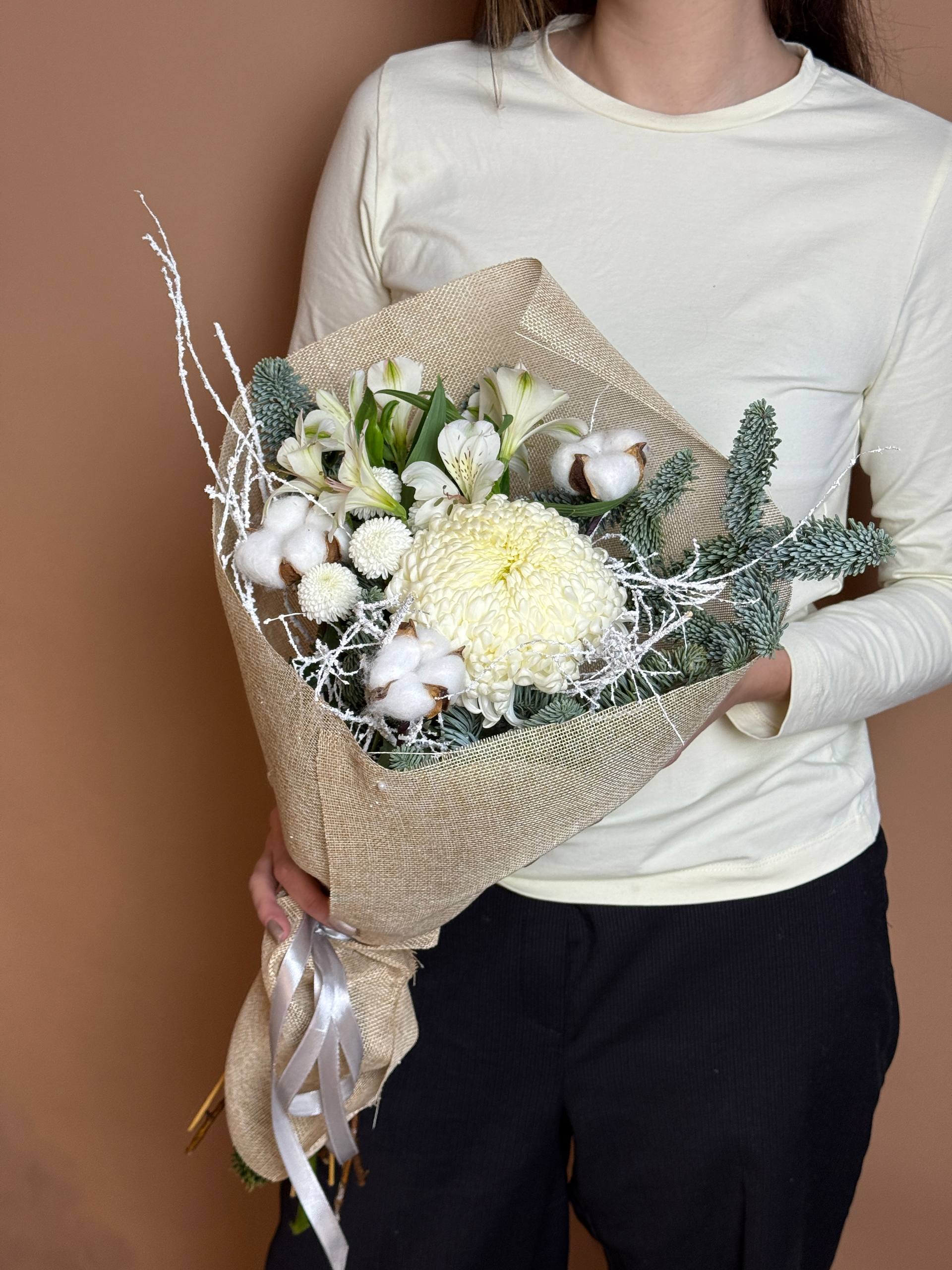 "Трава доставка цветов" представляет букет "Северное Сияние" – завораживающая и воздушная композиция, вдохновленная красотой зимней природы. Этот букет, сотканный из ароматной ветки нобилиса, нежных хризантем "Бигуди" и "Пуговка", изящной альстромерии, пушистого хлопка и акцентов из декоративных веток, создает ощущение загадочности и чистоты.