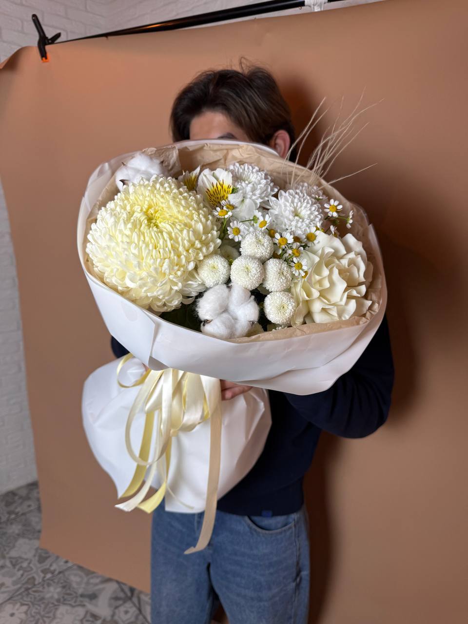 "Трава доставка цветов" представляет букет "Снежный Вихрь" – нежное и воздушное творение, воплощающее чистоту и изящество. Эта композиция, сотканная из белоснежных хризантем "Бигуди" и "Пуговка", элегантной розы "Мондиаль", утонченной альстромерии, полевой ромашки матрикарии, сухоцвета Алтая, пушистого хлопка и легкого ковыля, создает неповторимую атмосферу зимней свежести.