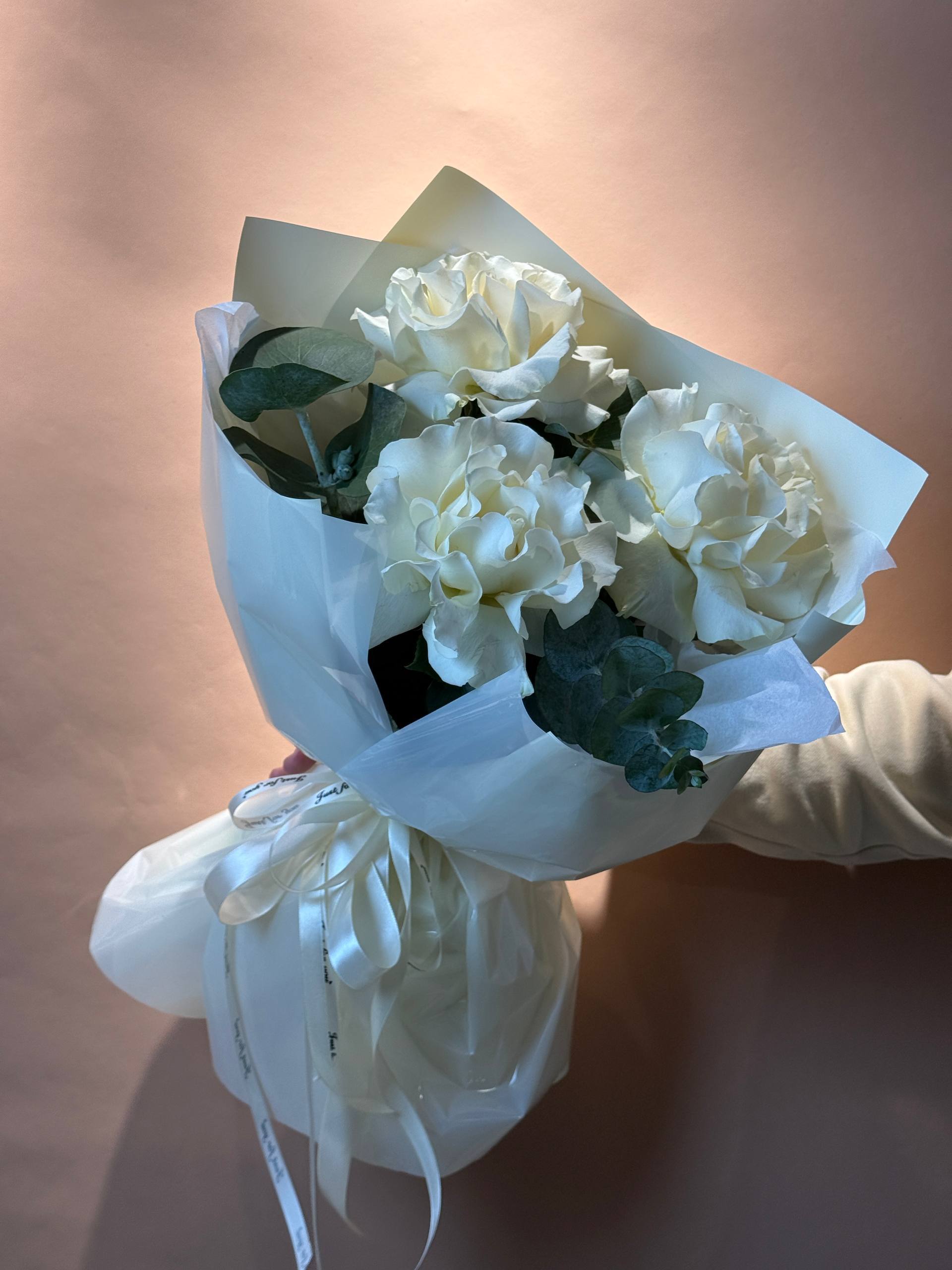 "Трава доставка цветов" представляет букет "Утренний Туман" – сдержанная и элегантная композиция, воплощающая чистоту и свежесть. Этот букет, где нежные розы "Мондиаль" искусно дополнены ароматным эвкалиптом, создает неповторимое ощущение спокойствия и умиротворения.