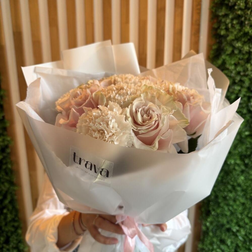 Букет «Вечер» — элегантная и стильная композиция, в которой французские розы подчёркивают изысканность, а диантусы добавляют выразительности и насыщенности. Такой букет выглядит роскошно и утончённо, создавая атмосферу особого вечера и даря ощущение праздника.