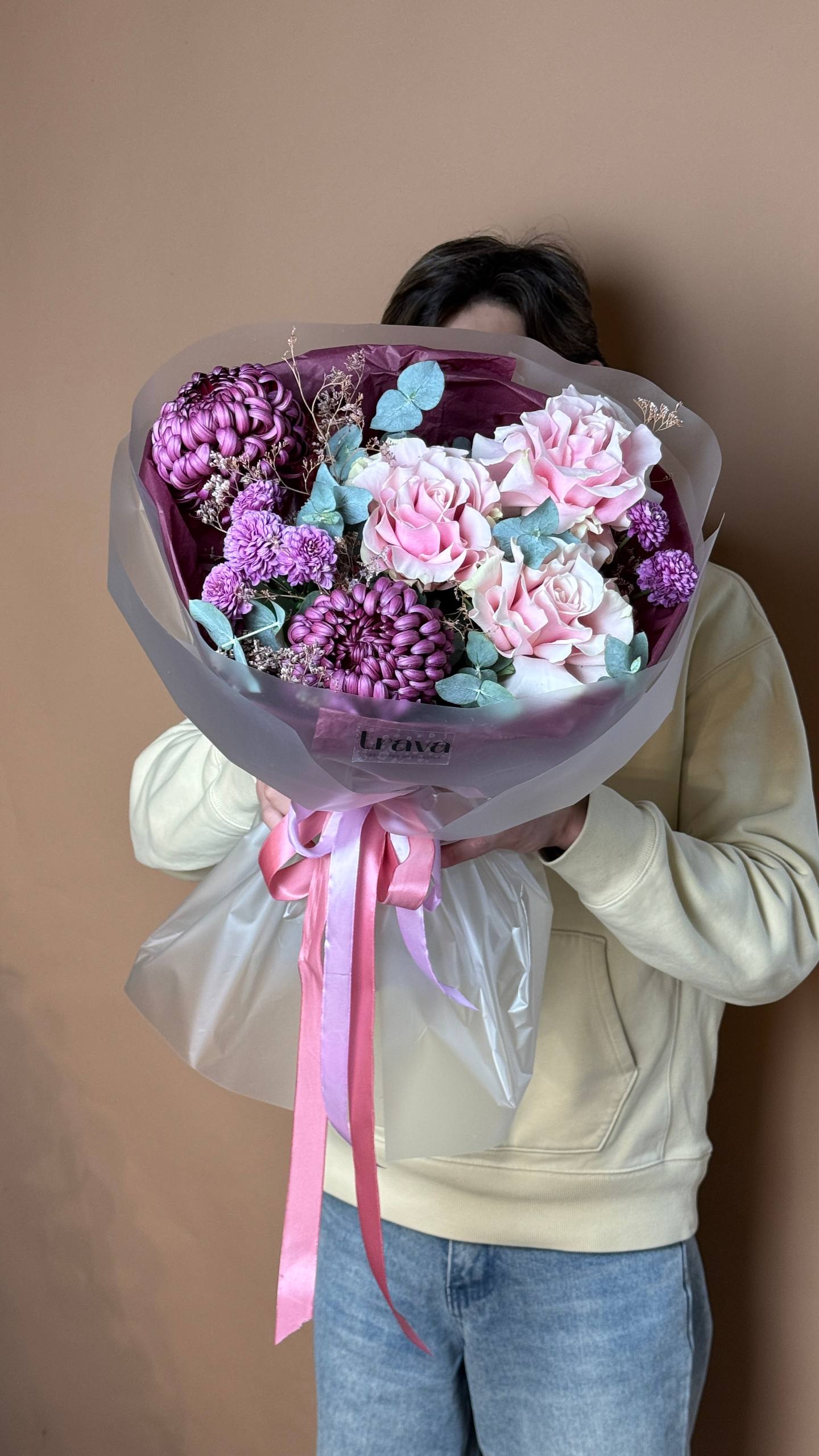 "Трава доставка цветов" представляет букет "Весенний Шепот" – нежная и воздушная композиция, наполненная свежестью и романтикой. Этот букет, где элегантные розовые розы "Мондиаль" гармонично сочетаются с пышными хризантемами, веселыми дубками и ароматным эвкалиптом, способен подарить ощущение легкости и восхищения.