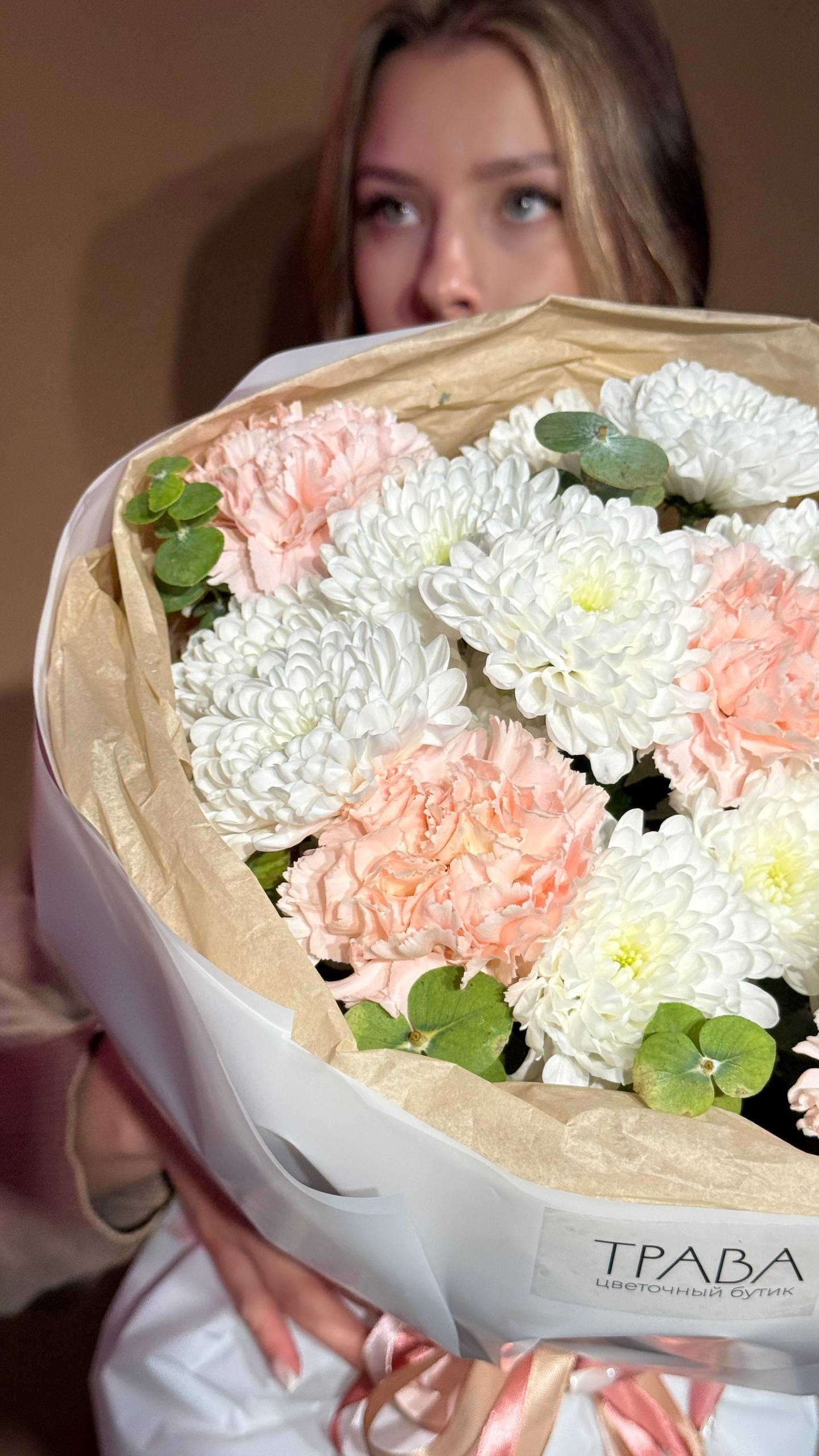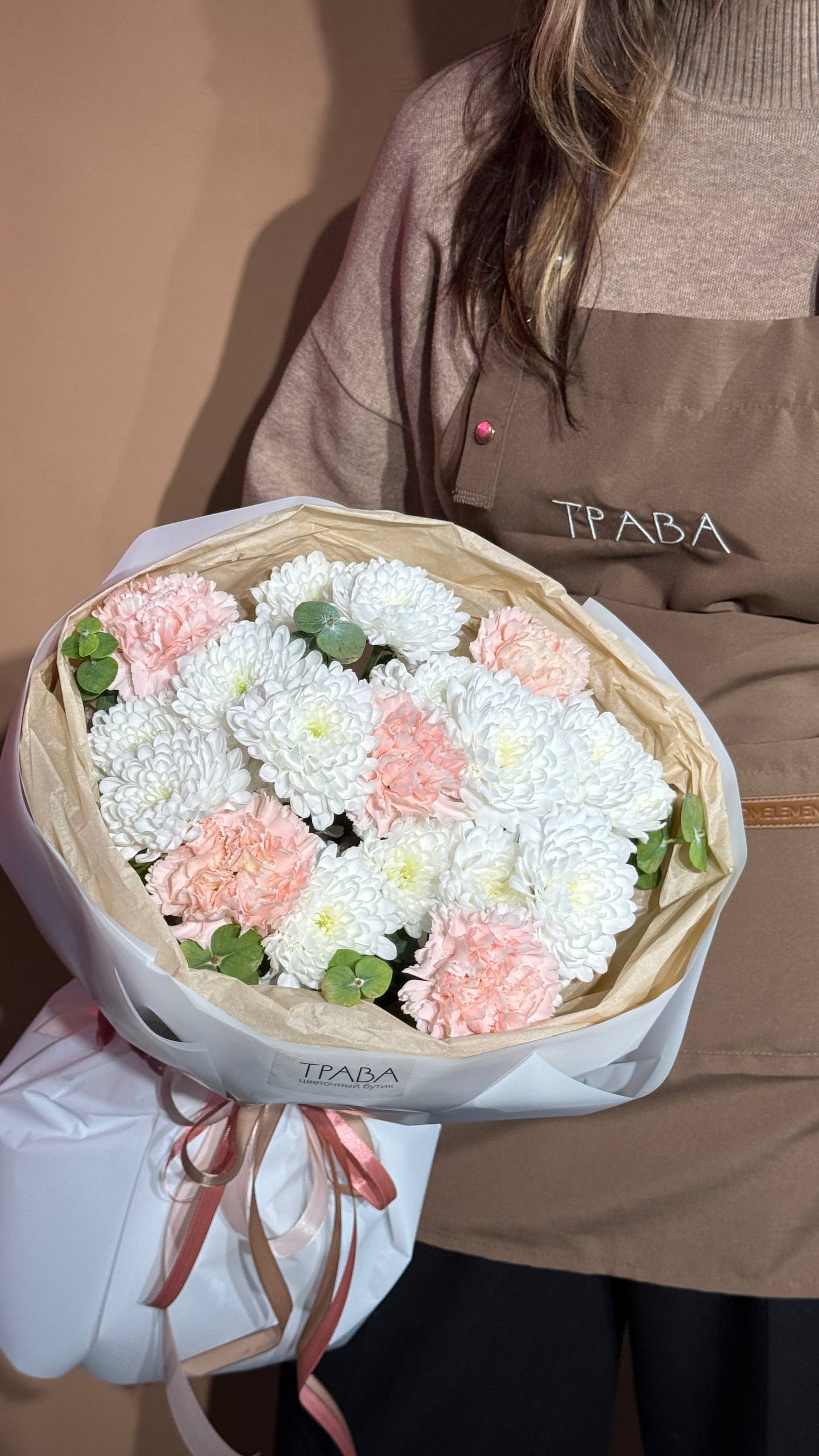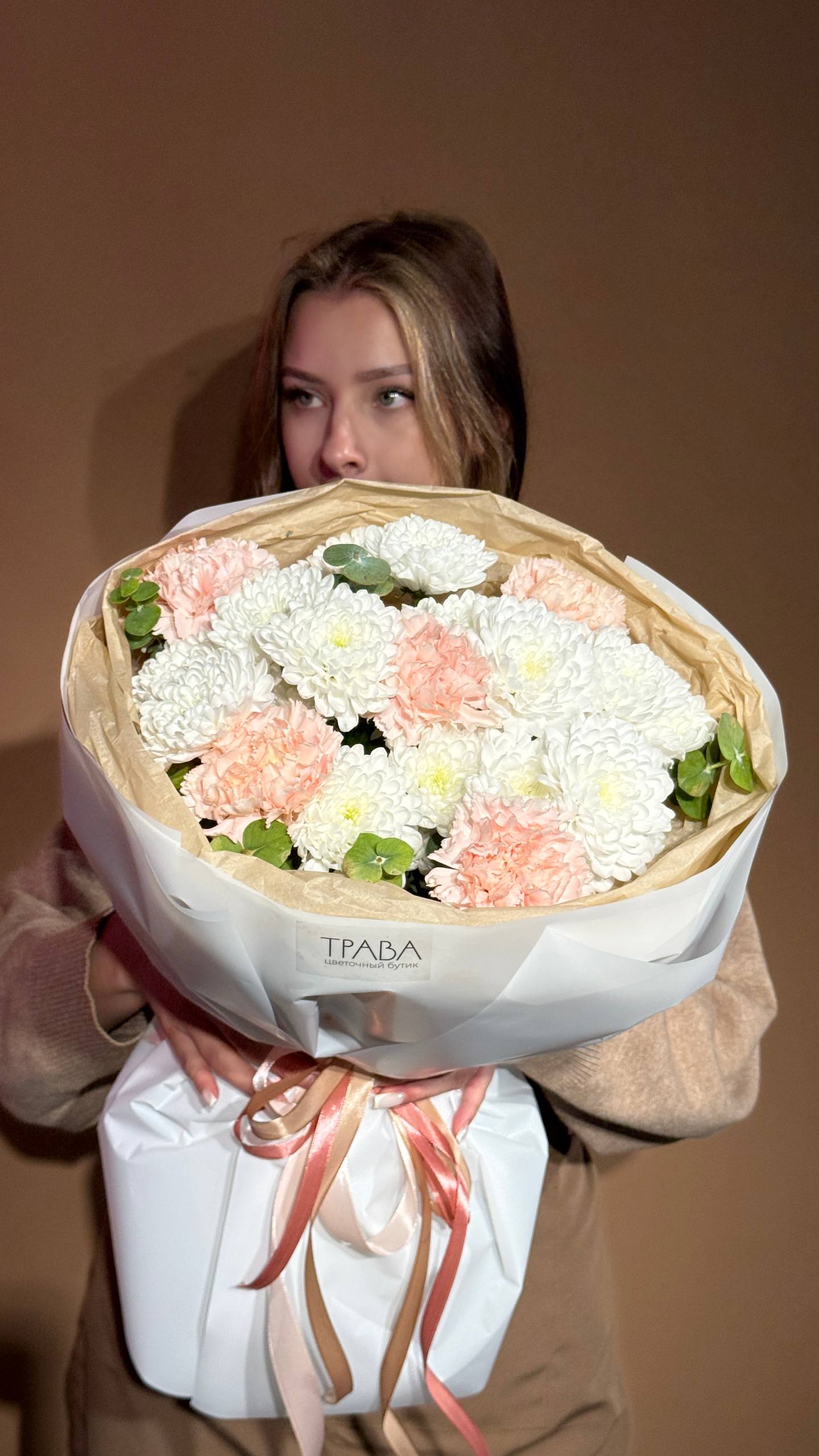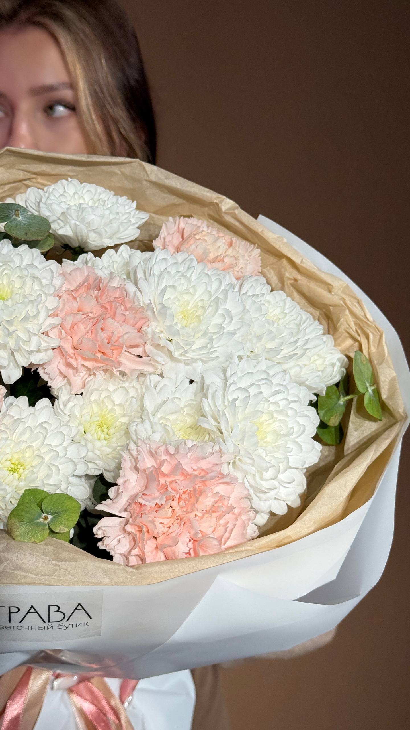 Букет «Весенняя нежность» — это воздушная и трогательная композиция, наполненная свежестью и лёгкостью пробуждающейся природы. Пушистые кустовые хризантемы, нежные диантусы и ароматный эвкалипт создают гармоничный образ, который станет прекрасным знаком внимания, чтобы порадовать, удивить и подарить тёплые эмоции вашей девушке, маме, сестре, подруге или коллеге в честь 8 Марта, дня рождения или просто для создания весеннего настроения.