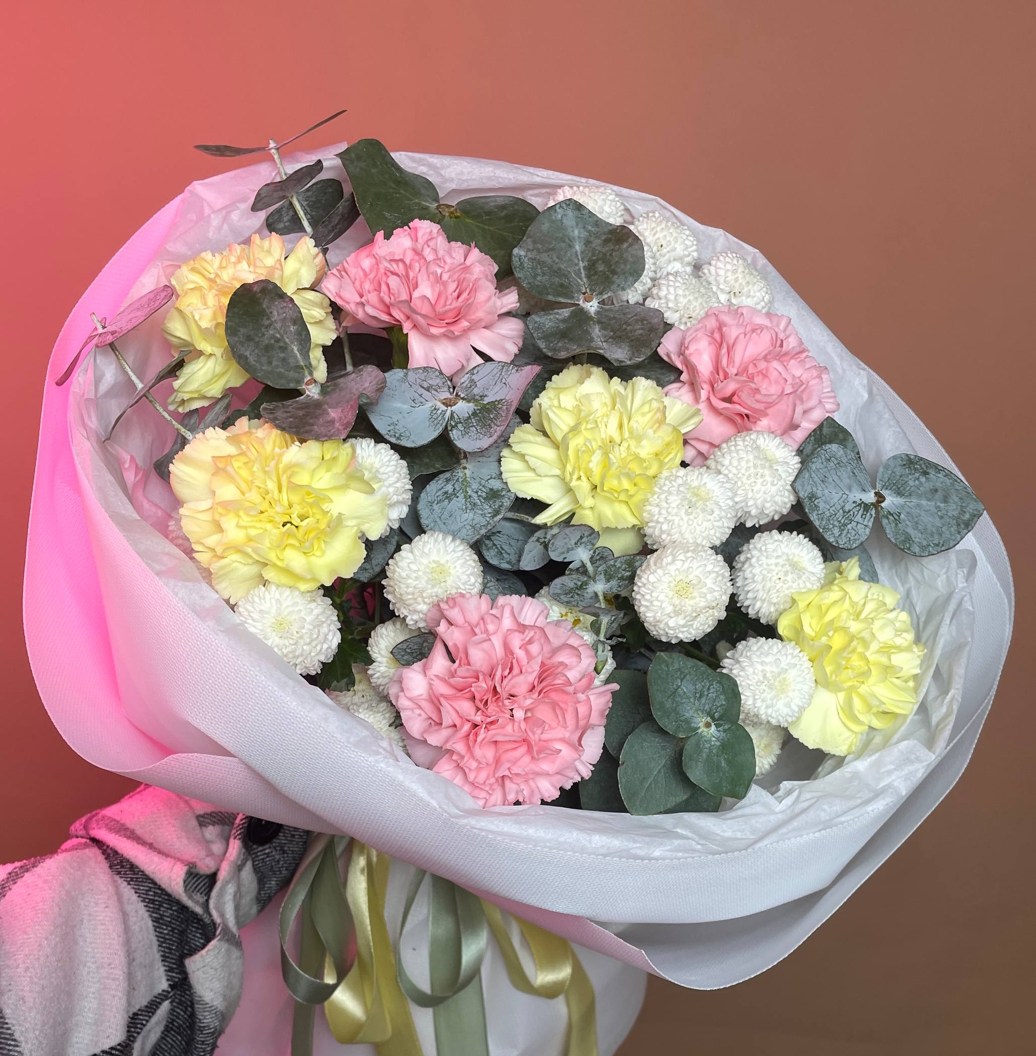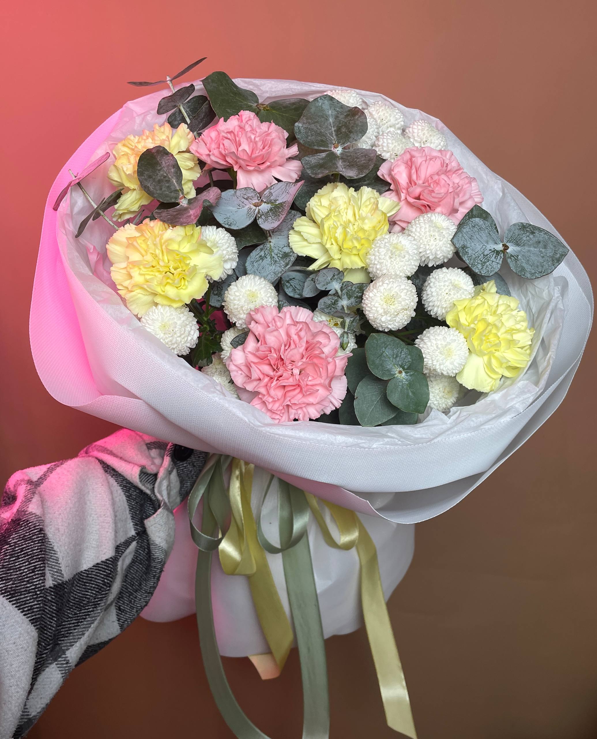 Букет «Весна» с диантусами микс, дубками и эвкалиптом — это яркая и свежая композиция, наполненная настроением пробуждения и радости. Нежные соцветия диантуса, трогательные пуговки, благородный эвкалипт и фактурные дубки создают лёгкий и стильный образ, который станет прекрасным знаком внимания, чтобы порадовать, удивить и подарить приятные эмоции вашей девушке, подруге, коллеге или близкому человеку без повода или в честь первого весеннего дня.