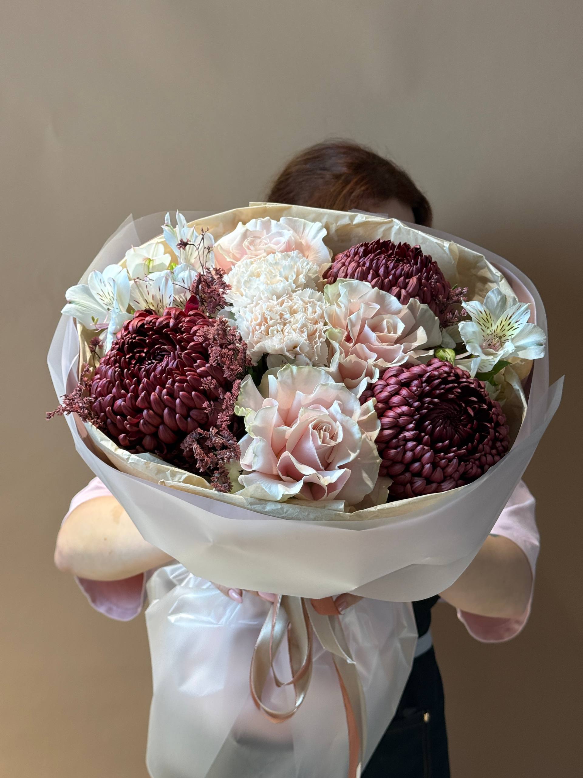 Оформление: Букет упакован в дизайнерскую бумагу цвета спелой малины, перевязан широкой атласной лентой.