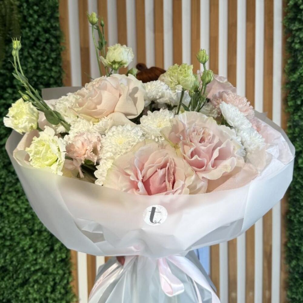 Букет «Ангелина» — изысканная композиция, созданная для выражения любви и нежности. Французские розы подчёркивают романтичный характер букета, диантусы добавляют утончённости, а лёгкая эустома и пышные хризантемы создают гармонию воздушности и объёма. Такой букет станет ярким признанием в чувствах и роскошным подарком для любимой женщины.