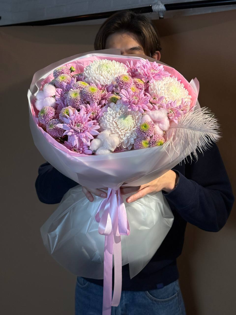 "Трава доставка цветов" представляет букет "Зимняя Мечта" – нежное и воздушное творение, призванное подарить ощущение уюта и волшебства. Эта композиция, сотканная из белоснежных хризантем "Шарик", очаровательных фиолетовых хризантем "Пуговка", изящных розовых дубков, пушистого хлопка и легкого пера, создает неповторимую атмосферу зимней сказки.