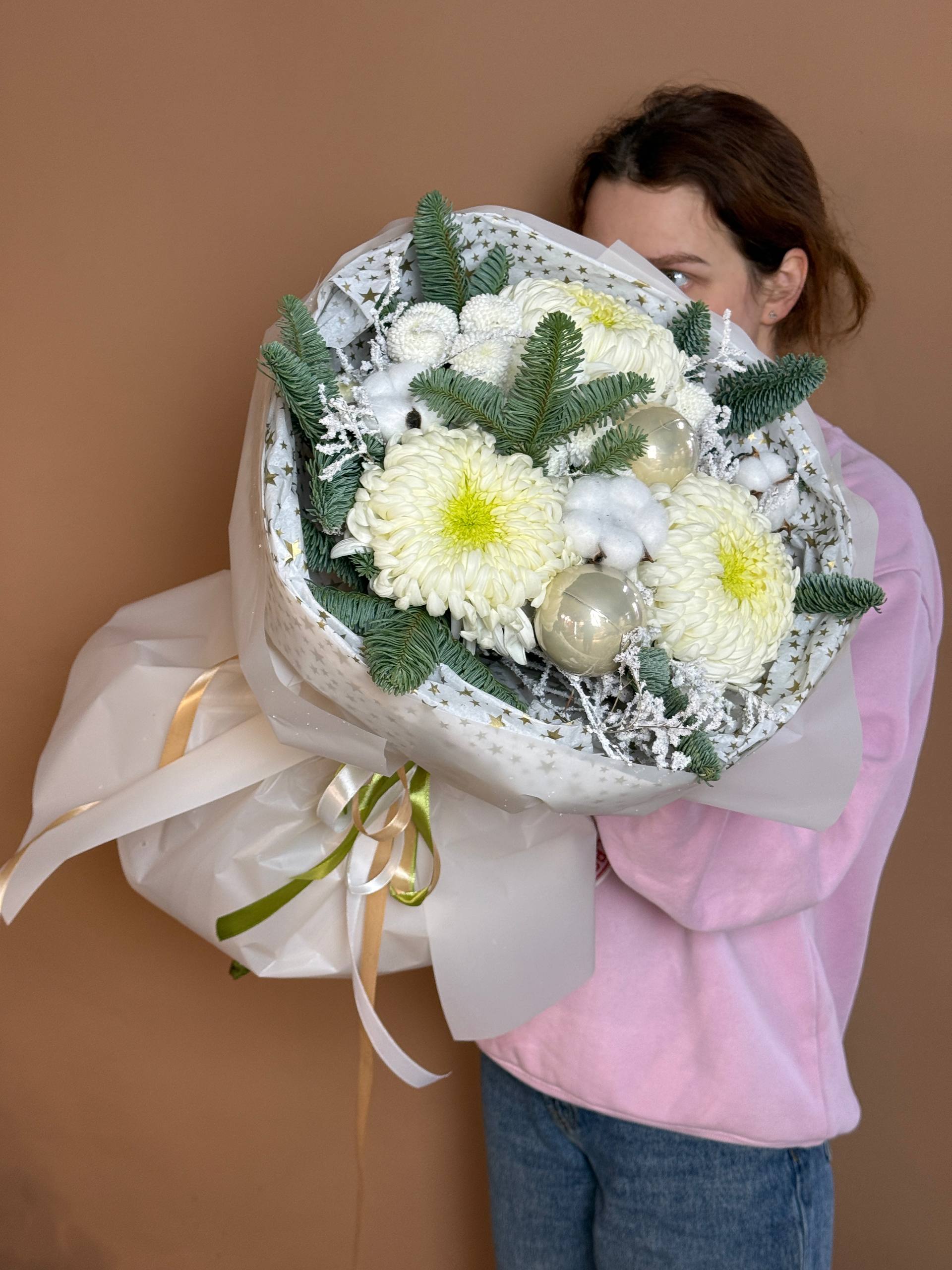 Оформление: Букет бережно упакован в матовую дизайнерскую бумагу нежного серо-голубого оттенка, перевязан тонкой серебристой атласной лентой. Новогодние игрушки и пушистый хлопок деликатно вплетены в композицию, придавая ей зимний шарм и праздничное настроение.
